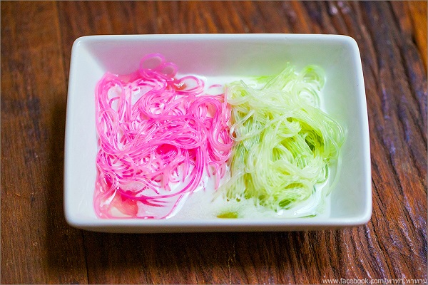 • ใส่เส้นซ่าหริ่มหลากสีลงในถ้วย